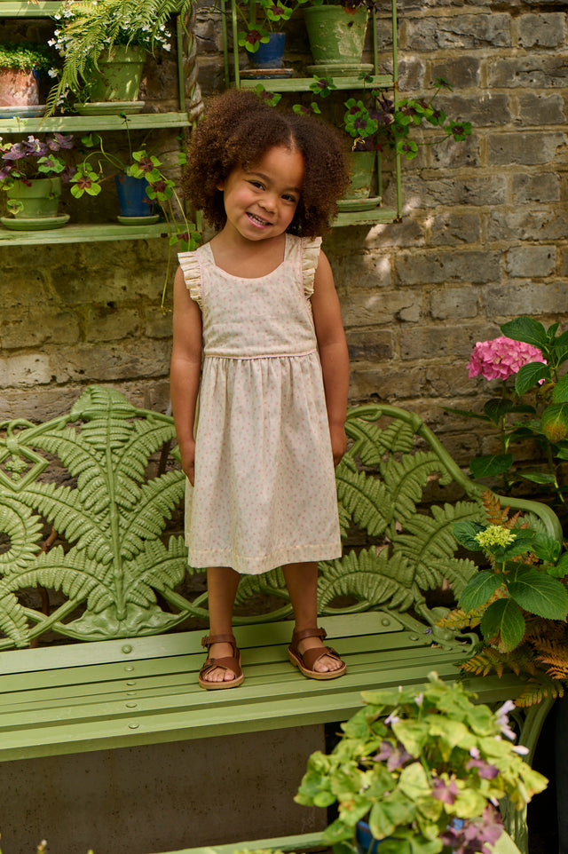 This absolute stunner of a summer dress is ideal for everyday wear or that special occasion you have been waiting for. Wear it to the park or play dates it’s incredibly light in the softest of cotton adorned with flowers reminiscent of a summer field. A delicate ruffle runs around the shoulders and upper body front reaching towards the back with show stopper straps fastened by a single button in a crossover style. A pretty pink piping runs across the front and back of the dress accentuating the soft colours.