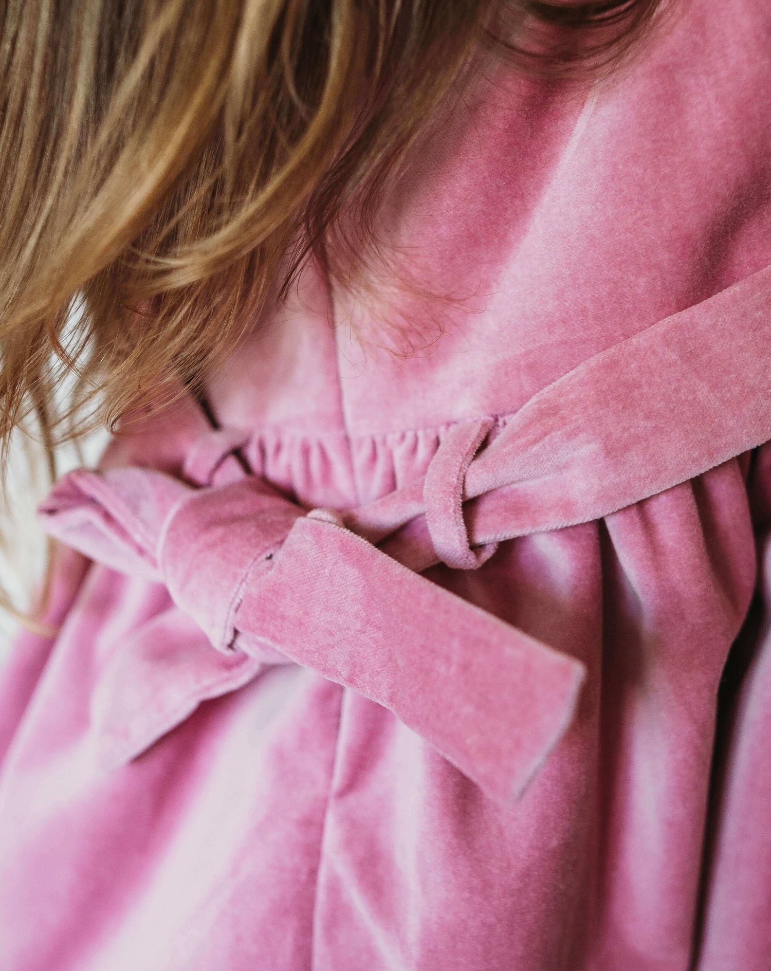 An absolute showstopper of a dress for this coming festive season.  Perfect for any ballet loving little girl and for those special trips to the theatre or ballet with grandparents and parties alike.  Hand smocked with beautiful ballet shoes and ribbons in luxurious deep pink cotton velvet fabric.  All finished with a sweet ruffle collar and sleeves and a beautiful tie belt at the back.  Please note colour of pink velvet may vary due to a different batch of velvet.